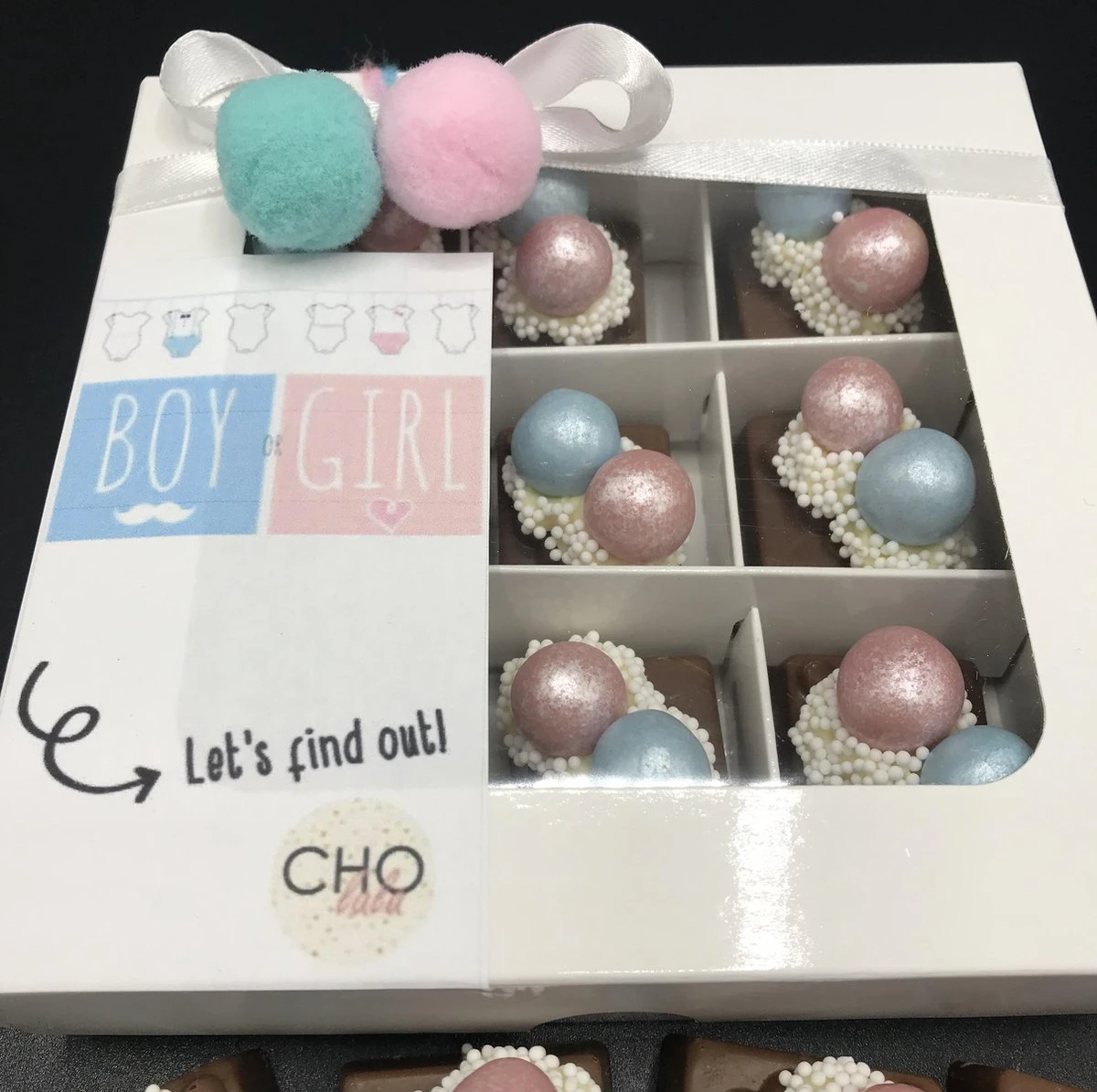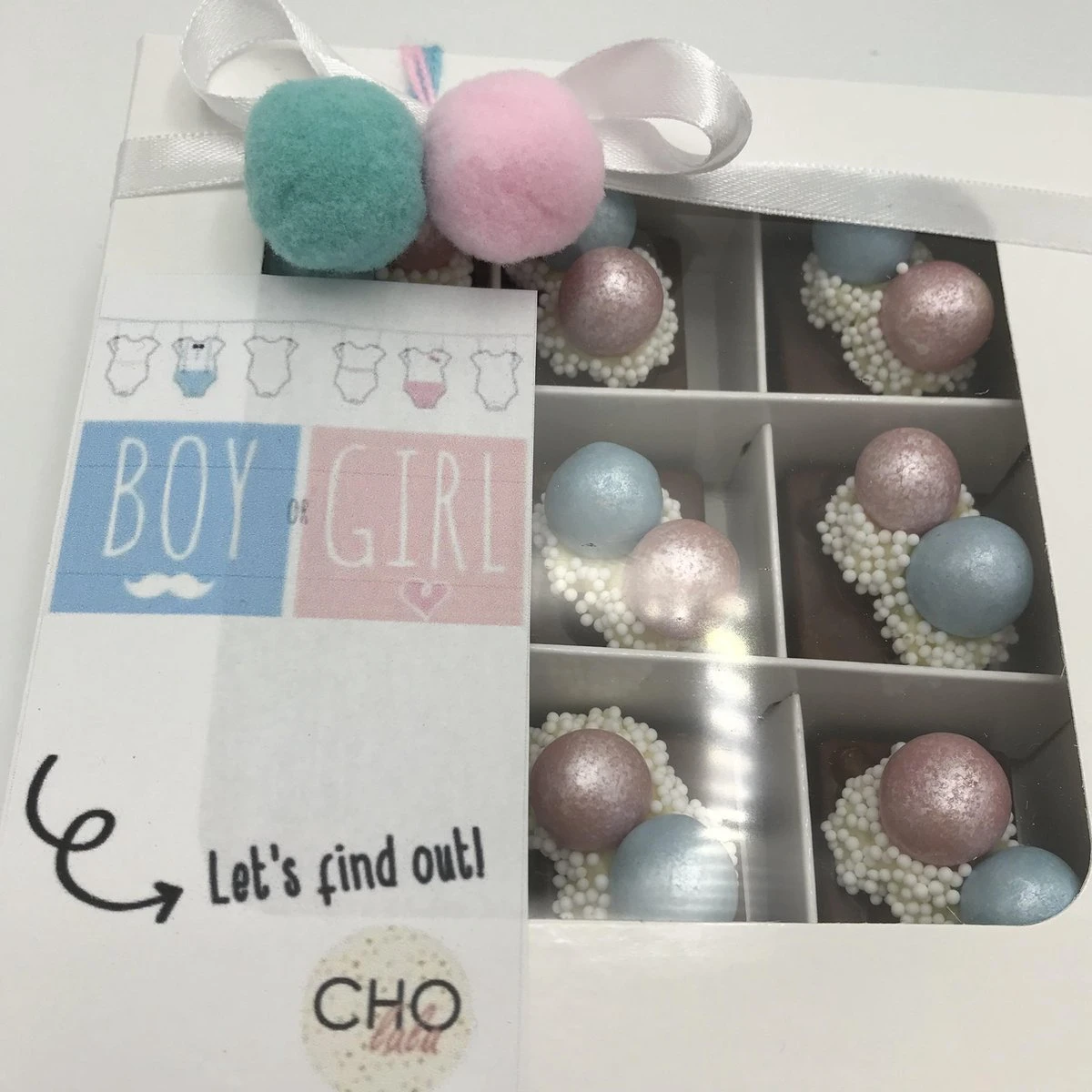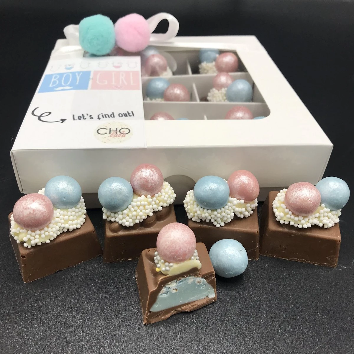 Een mooi doosje van 9 stuks (200 gram) handmade melkchocolade bonbons met een romige babyblauwe vulling met anijsmuisjes. Dus pas op het moment dat je de bonbon doorbijt, komt de BLAUWE vulling tevoorschijn. De bonbon is opgemaakt met een roze en blauw bolletje, gemaakt van krokante koek.