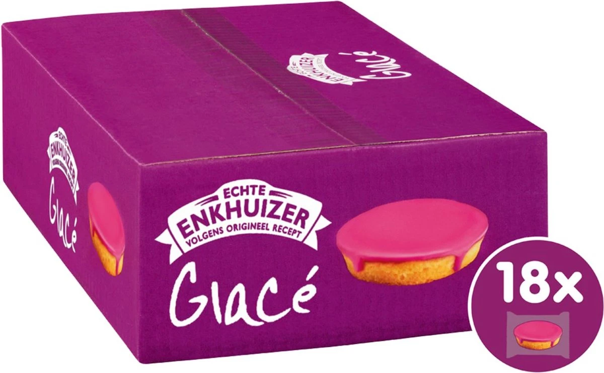 Echte Enkhuizer Glacé Original zijn verkrijgbaar per doos van 18 stuks en zijn per stuk verpakt. Deze glacé is een zachte cake met een roze fondantlaagje van frambozen-aardbeienglazuur. Deze koek in handige meeneem verpakking heerlijk voor bij de koffie/thee of als lekker tussendoortje.