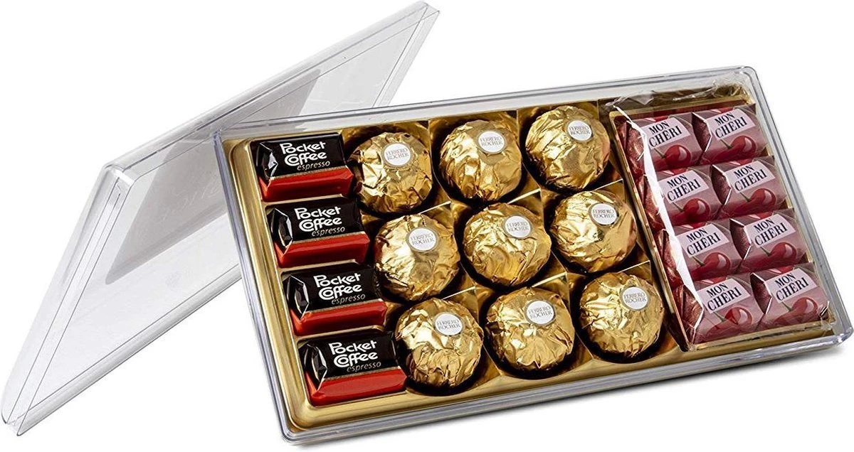Ferrero Prestige is a rich chocolate that come in individually wrapped wrappings. An assortment of fine confections sure to delight the senses. Fine hazelnut chocolates Rocher, coffee flavoured Pocket Cofee and wonderful Mon Cheri liquer chocolates.