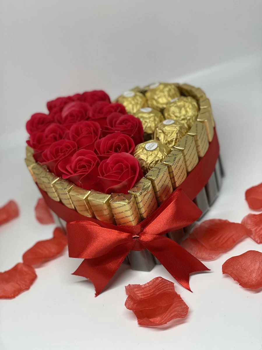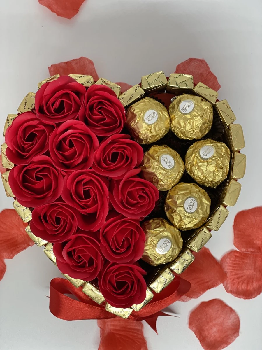 Deze chocoladehart is omhuld met merci chocolade. Deze is goed gevuld met Ferrero Rocher chocolade en rode rozen gemaakt van zeep.
