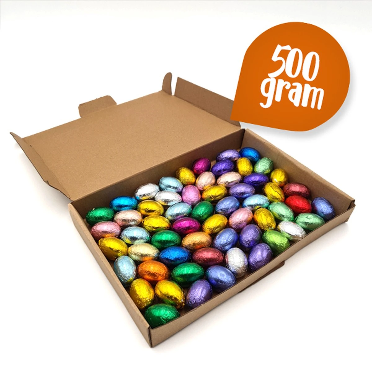 Om de staniol eitjes scherp aan te kunnen bieden zullen we deze direct verpakt in een verzenddoos opsturen. De 500 gram en 1000 gram doosjes passen tevens door de brievenbus, thuisblijven is dus niet nodig.