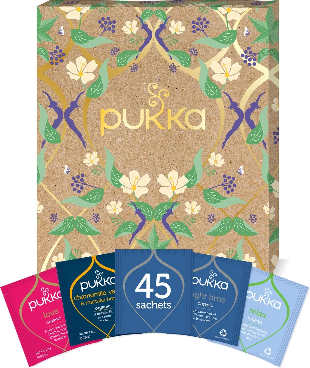 - Pukka Kruidenthee Relax Thee Selectiebox bevat 45 zakjes biologische thee