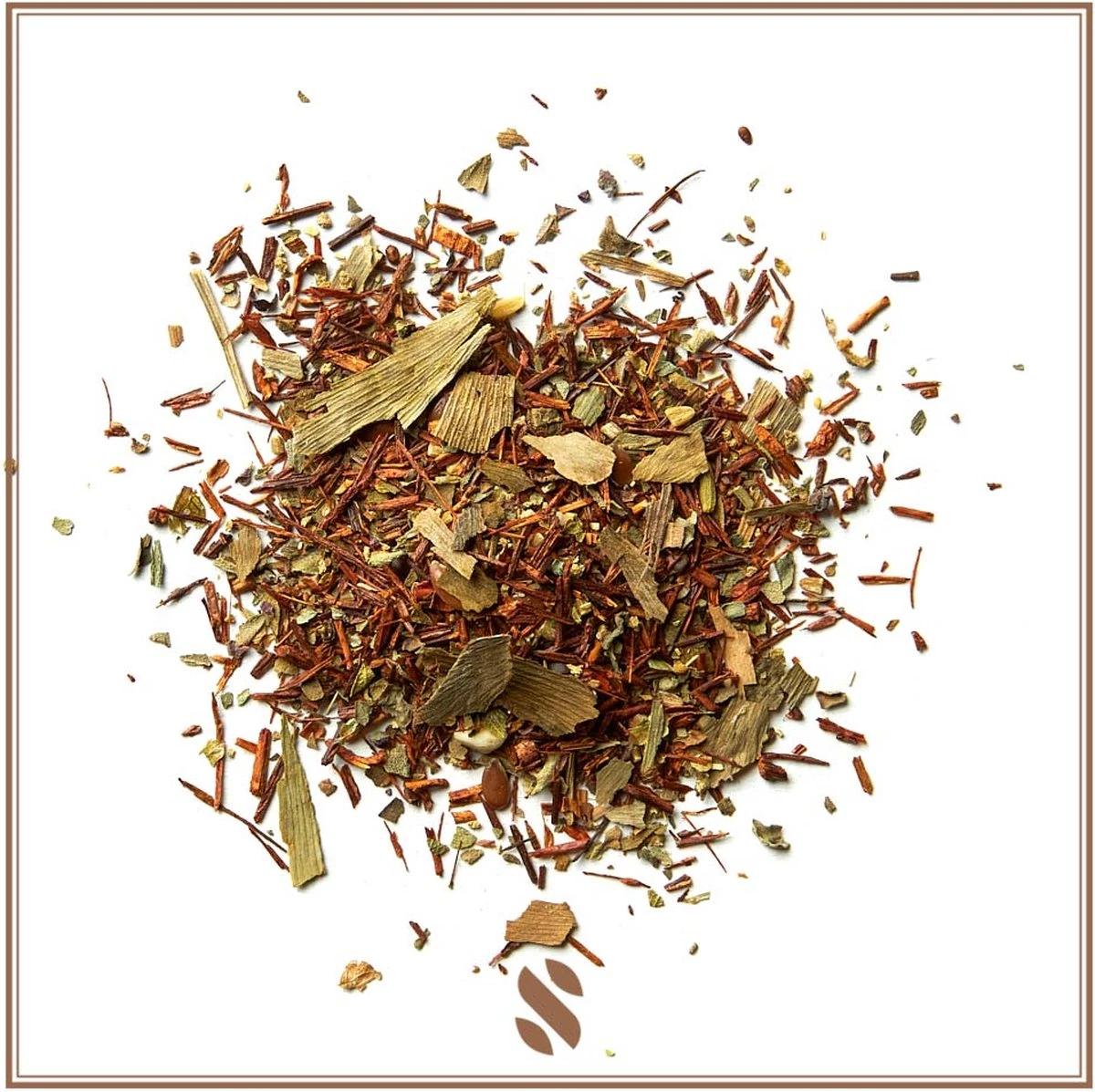 Rooibos 51%, Basilicum, Lijnzaad, Ginkgobladeren, Zoete Venkel, Amandelstukjes