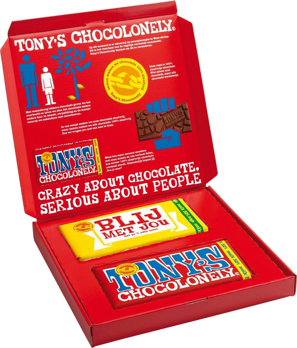 Wat je ook te zeggen hebt, je zegt ’t met een reep. Da’s beter dan een mond vol woorden. Wij hebben ‘m al mooi verpakt in deze Tony’s Chocolonely cadeaudoos. Wie wil dit chocoladecadeau nou niet op z’n deurmat?