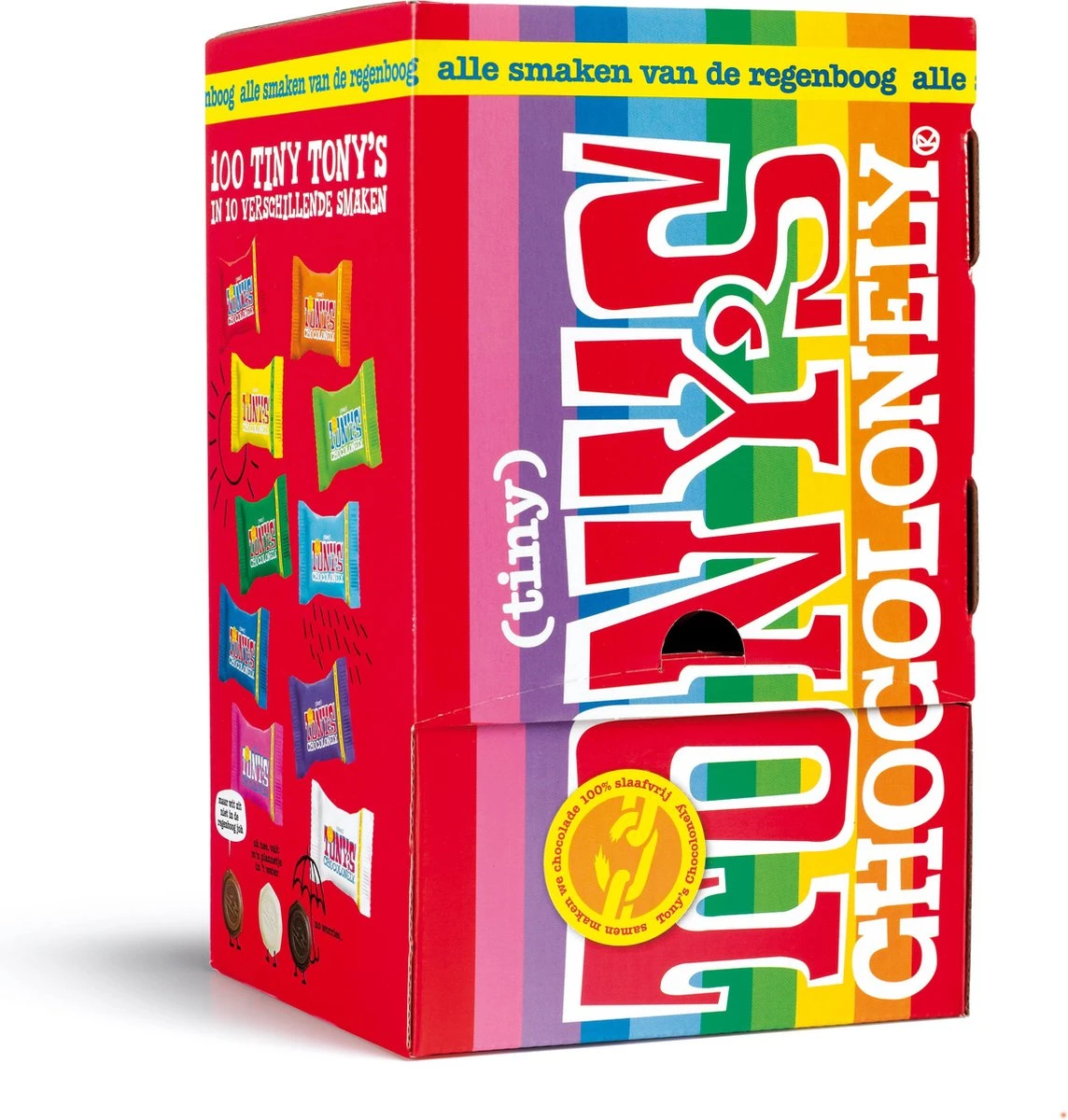 Voor alle Tiny lekkere trekmomentjes, voor alle ‘je-wordt-bedankt’jes, voor alle goedmakertjes en natuurlijk voor bij elk kopje koffie, thee of glaasje chocolademelk. In deze doos zitten 100 Tiny Tony’s in een mix van 10 smaken (melk, melk karamel zeezout, melk noga, melk hazelnoot, puur amandel zeezout, donkere melk, puur, donkere melk pretzel, wit en wit framboos knettersuiker).